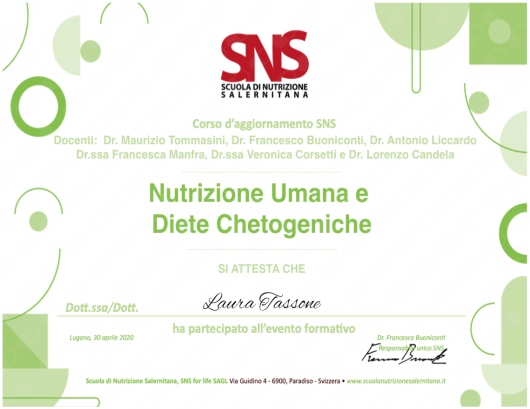 Successivamente mi sono specializzata in Nutrizione, conseguendo un Master in Nutrizione Umana presso la sede di Milano della NUTRIFOR – Alta Formazione In Nutrizione e continuando poi la mia formazione presso la SCUOLA DI NUTRIZIONE SALERNITANA (SNS), presso la quale ho seguito il Corso d'Aggiornamento "Nutrizione Umana e Diete Chetogeniche", il Corso di Formazione e Aggiornamento "Nutrizione Clinica 2.1" e altri corsi specializzanti e di approfondimento. In particolare sono esperta in Nutrizione Clinica e mi occupo con passione, competenza e attenzione degli aspetti nutrizionali legati alle varie patologie, che spesso vengono trascurati o messi in secondo piano.